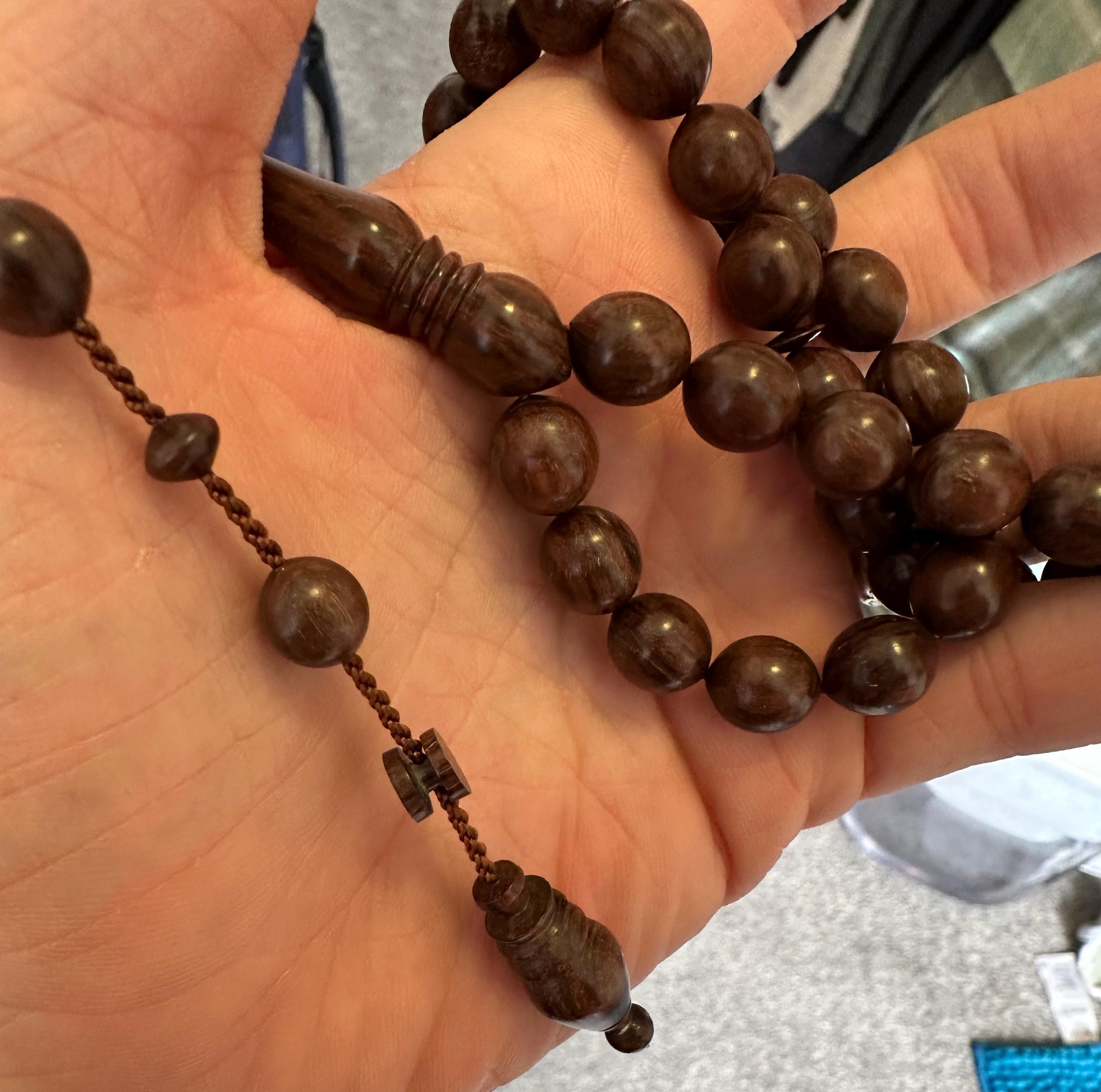 A string of prayer beads that are carried around by many people, used either as a companion to keep track of how many prayers have been said or as a fashionable and prestigious accessory for relaxation, cutting down on smoking, doing tricks, keeping your hands busy and as an expensive status symbol.
